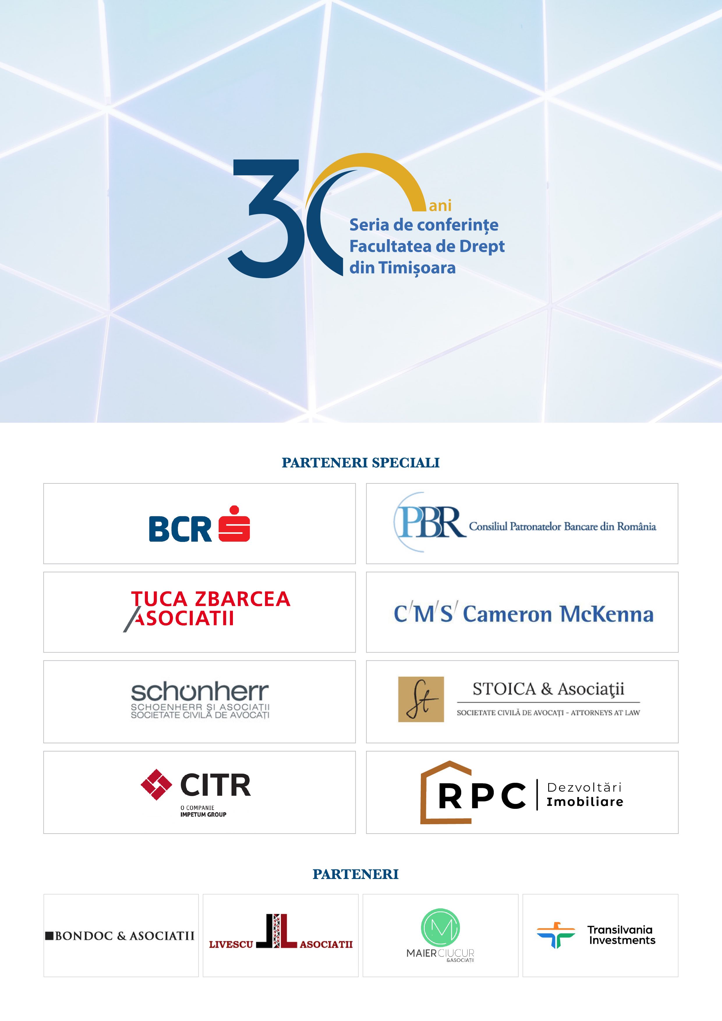 Seria de conferințe Facultatea de Drept din Timișoara – 30 de ani este susținută, în calitate de Parteneri Speciali, de Banca Comercială Română, Consiliul Patronatelor Bancare din România, Țuca Zbârcea & Asociații, CMS Cameron McKenna Nabarro Olswang, Schoenherr România, STOICA & Asociații, CITR – part of Impetum Group și RPC Group.